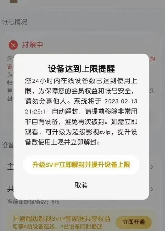 近期,视频平台会员权益问题不断引起关注。据此前报道,2月2日,爱奇艺因会员权益问题登上热搜。一名爱奇艺会员因同时使用3台设备登录,而导致账号被封。用户想要解封时发现,平台要求充值更贵的会员才能解封。