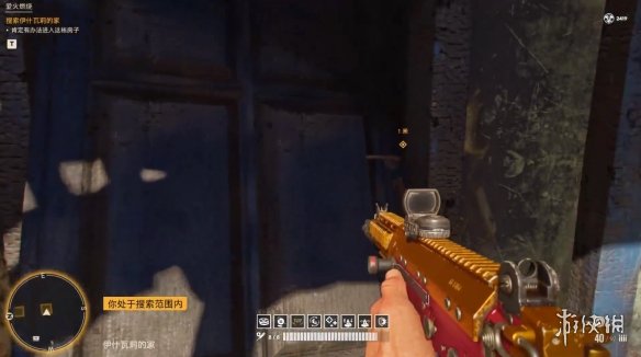 2.触发任务后,往前走会看到两栋房子。先去右边的那个。
