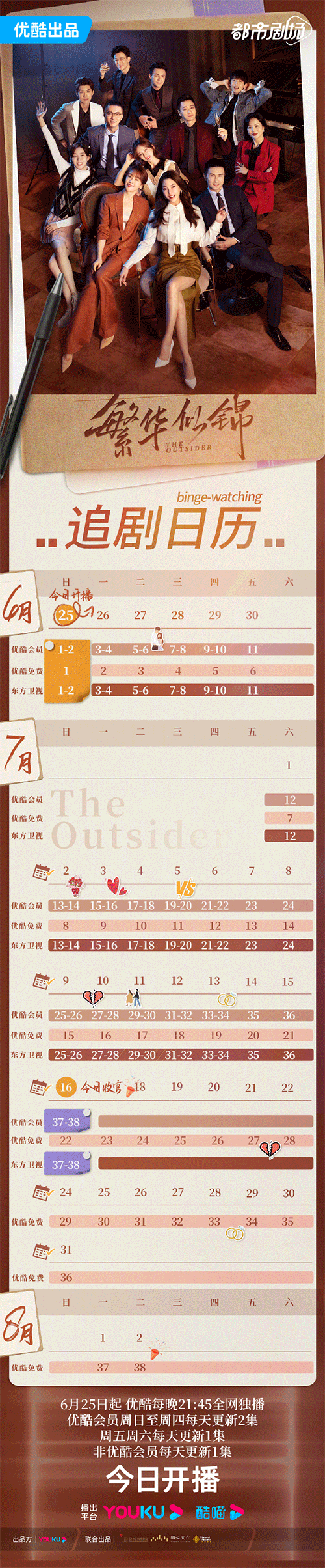 繁华似锦今日开播,追剧日历即将到来!以爱为名,错入繁华。6月25日起,每晚21:45,优酷全网独播。优酷会员周日至周四每天更新2集,周五周六每天更新1集,非优酷会员每天更新1集。来和宿墨和王娟一起开始浪漫之旅吧!