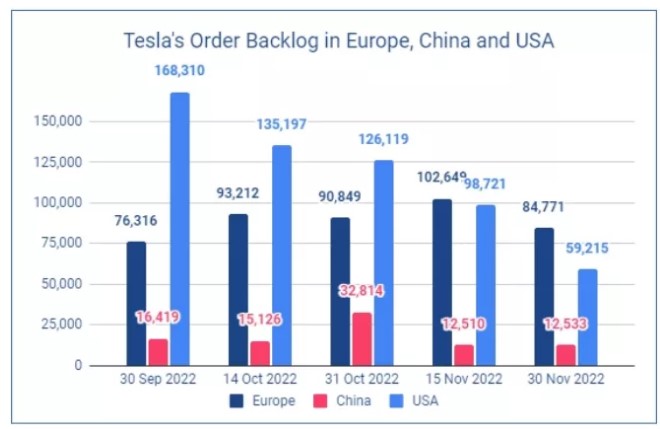 斯拉全球电动汽车订单积压量近月来一直在迅速减少,截至 2022 年 11 月 30 日已降至 19万辆。据称,19万辆的数量大约对应着 44 天的产能。