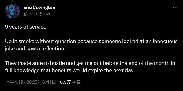 4月份离职,他是被公司开除,而不是主动离职。在推特上,他终于解释了自己被解雇的原因。